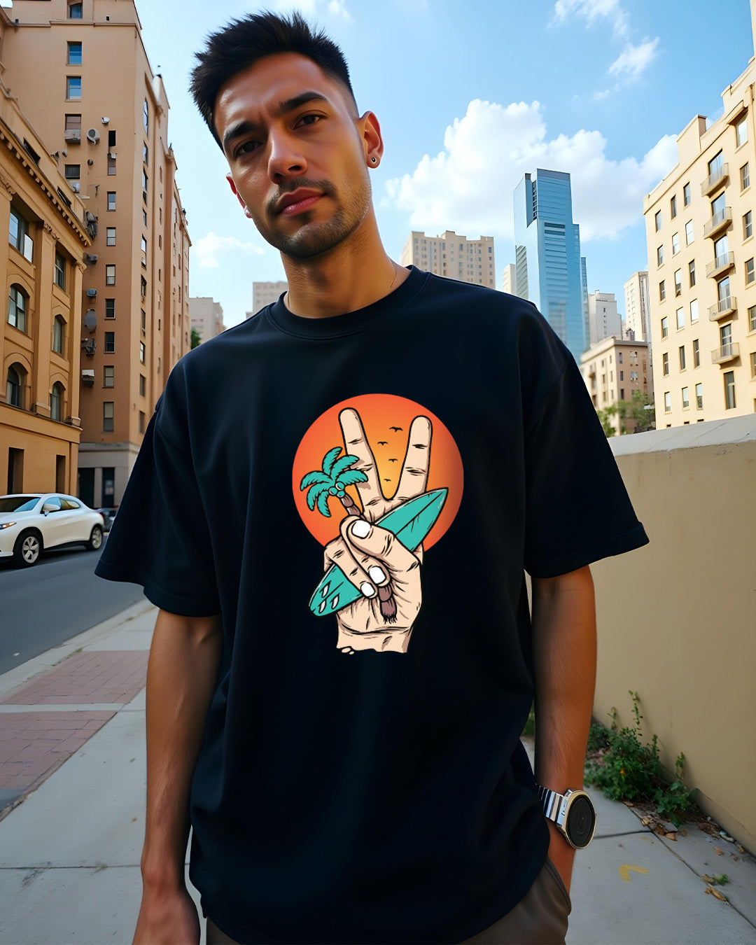 The sky above, Sand below, Peace within. This oversize t-shirt comes with half sleeves and has a loose fit. The t-shirt is detailed with a digitally printed Beach view & Peace sign. It is made with cotton material which will give you the utmost comfort. Style it with your fav denim, sneakers, and sunglasses for that party wear look.